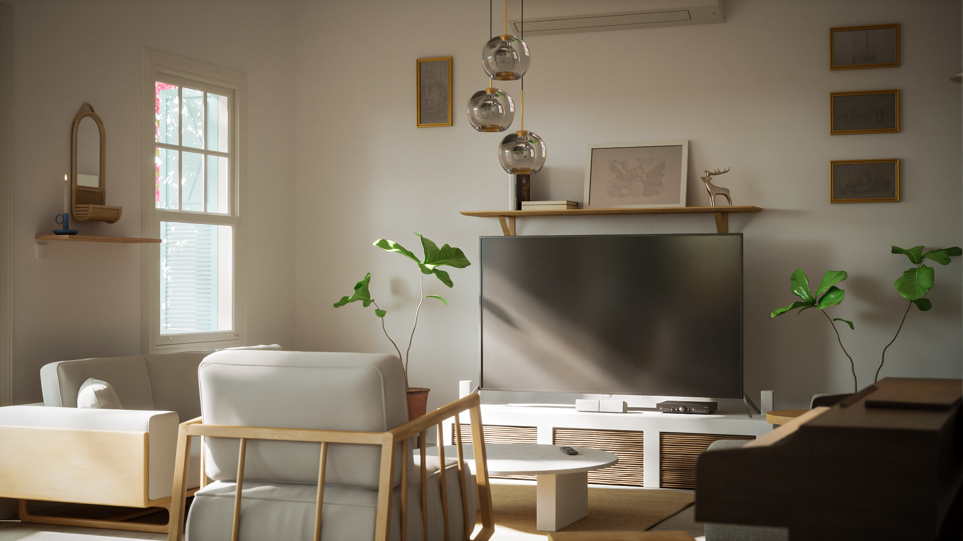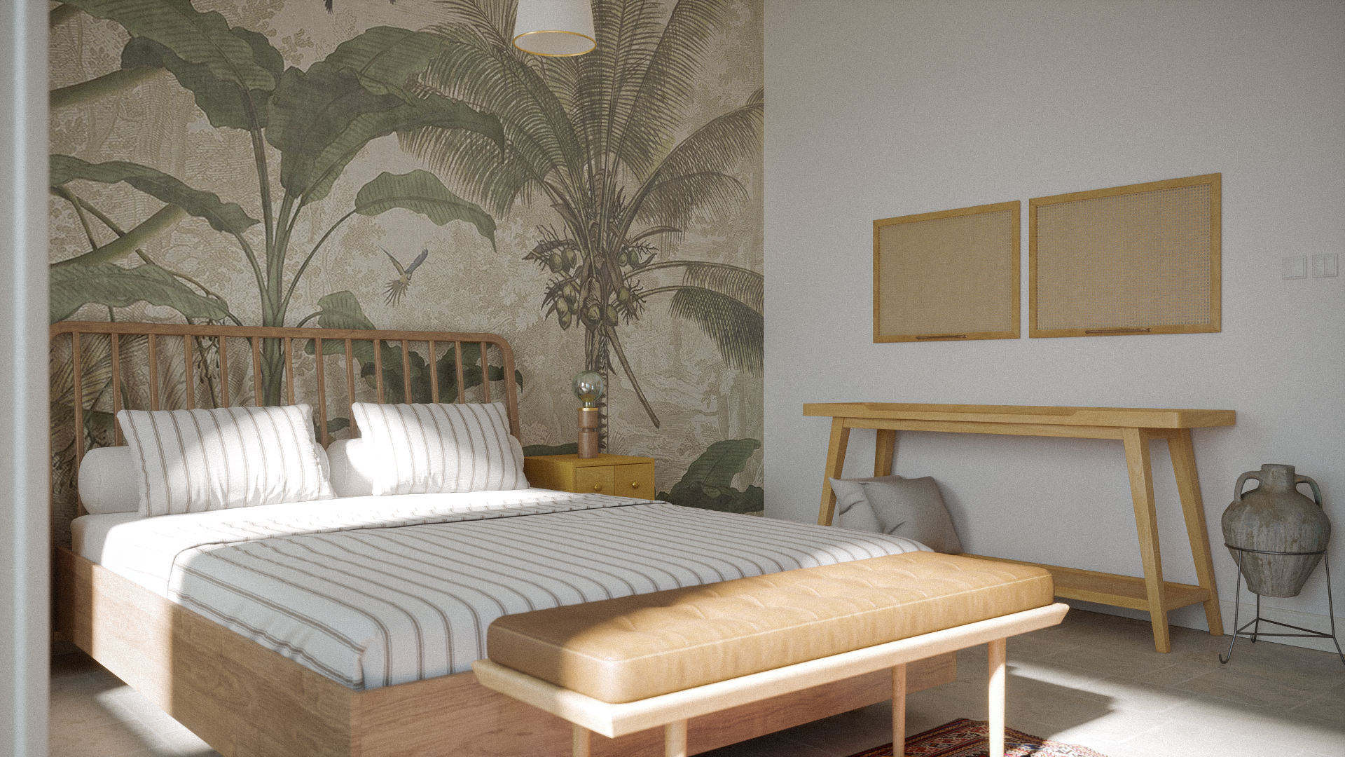 This project focused on the renovation and interior redesign of a residential home, transforming dated spaces into a fresh, cohesive living environment with a modern, warm aesthetic. The design aimed to enhance natural light, maximize spatial comfort, and reflect a calm, nature-inspired atmosphere. Key spaces include a newly remodeled kitchen with bold blue cabinetry and patterned backsplash, a serene tropical-themed bedroom with natural textures, and a minimalistic yet cozy living room. The selection of furniture, finishes, and decor followed a Scandinavian-Boho style, emphasizing clean lines and organic materials. I was responsible for the full design process, from concept development to final renderings, helping the client visualize and refine every detail before renovation began.